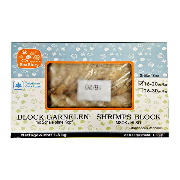 Garnelen(V) m.S.o.K Block – 16/20 / Shrimps(V) HLSO Block – 16/20 / 白虾(块冻) 无头有壳 16/20